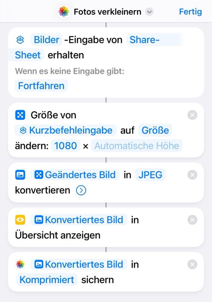 Zum Text gebe ich immer auch noch Bilder oder Videos dazu. Die Bilder dürfen nicht allzu gross sein. Das war auch eine Herausforderung, wie ich das mit meinem Handy bewerkstelligen kann. Eine Recherche im Internet hat mich dann zu verschiedenen YouTube Seiten gebracht auf welchen erklärt wird wie mit der App „Kurzbefehle“ solche Vorgänge automatisiert werden können. Nach etwas herum proben hat es funktioniert, ich war ziemlich stolz auf mich. Nun kann ich die gewünschten Bilder auswählen und mit einem Klick werden die Bilder verkleinert, die Metadaten werden entfernt, es wird ein JPEG daraus generiert und schlussendlich kommen die Fotos noch in einen speziellen Ordner.