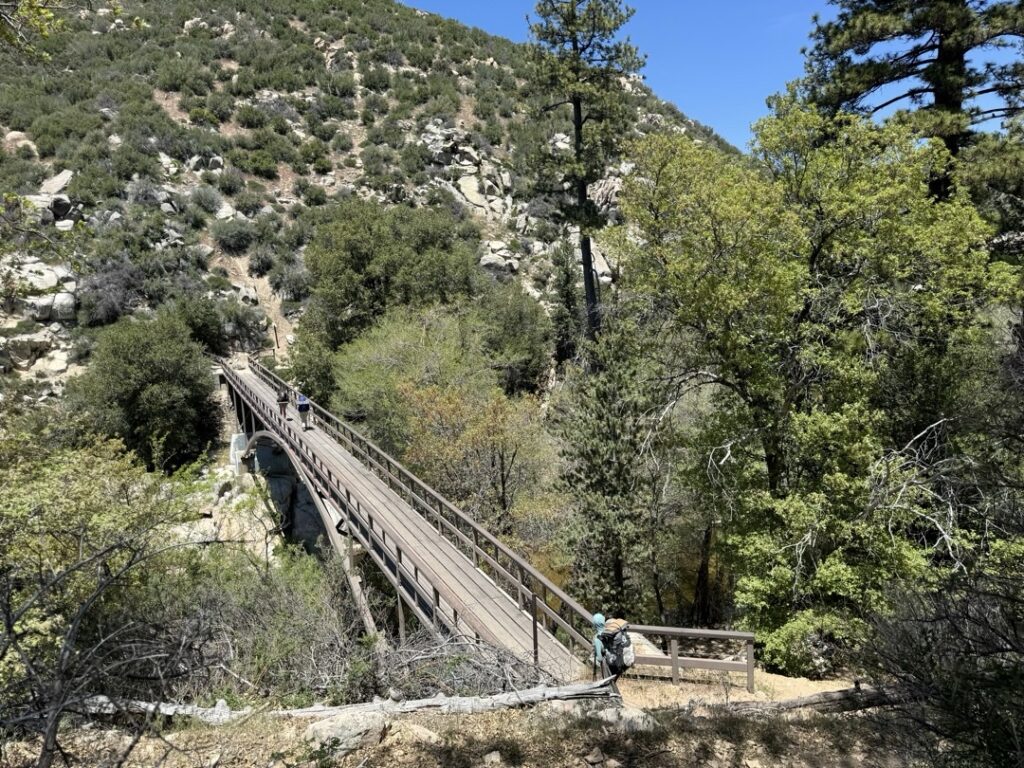Gemäss Planung sind nicht so viel Höhenmeter abzulaufen, aber durchaus etwas 1’000 m wo es runter ging. Ich bin auf dem guten Weg auch gut vorwärtsgekommen. Nach circa 1 Stunde ging es zum Holcomb Creek runter. Spätestens in diesem Moment hatte ich keinen Internet Empfang mehr und musste so auch meine Telefongespräche abbrechen. Innerhalb von rund 3 km musste der Fluss dreimal überquert werden. Zweimal konnte ich diesen, mit akrobatischen Einlagen, mit trockenen Füssen überqueren. Beim dritten Mal gab es keine Möglichkeit mit trockenen Füssen rüberzukommen. Daher habe ich alles abgezogen (Gamaschen, Schuhe und Socken) und bin barfuss rüber gelaufen. Nur schon dieser Aufwand um alles abzuziehen die Füsse zu trocknen und später alles wieder anzuziehen, hat mich sicher 15 Minuten Zeit gebraucht.