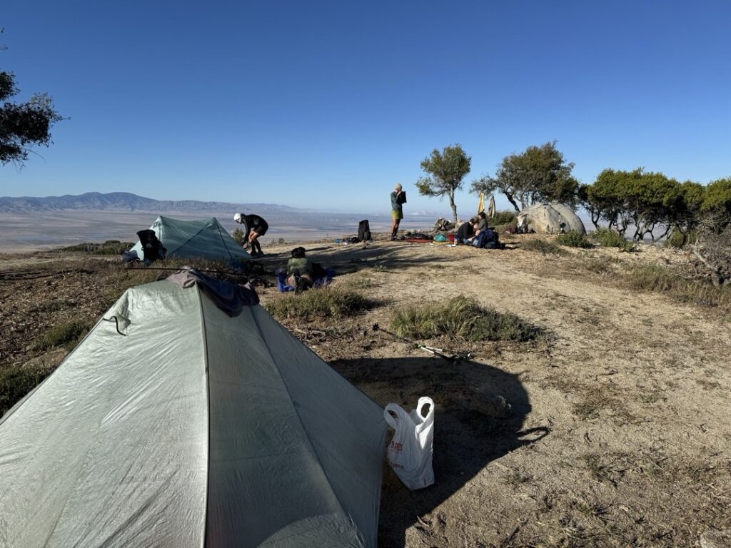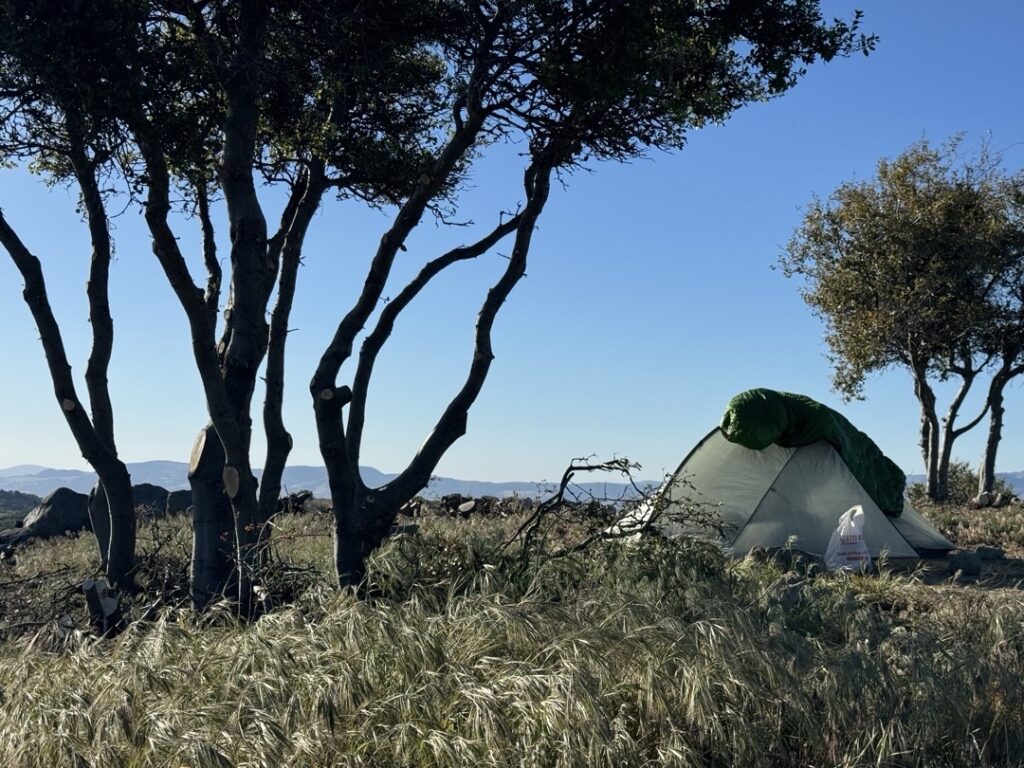 Zu sechst haben wir uns dann entschieden direkt hier zu übernachten. Ich und Scotty haben unser Zelt aufgestellt, die anderen vier haben sich für Cowboy Camping entschieden. Dies bedeutet, dass die Schlafmatte auf eine Unterlage gelegt wird, und anschliessend noch der Schlafsack oben rauf. Für mich kam das Cowboy Camping so oder so nicht infrage, da ich keinen Schutz für meine Schlafmatte dabei habe. Zudem mag ich es im Zelt zu liegen. Ich bin gespannt wie sich der Wind in der Nacht entwickeln wird. Aus Sicherheitsgründen, wie eigentlich immer, habe ich jeden Hering noch mit einem grossen Stein beschwert. Möchte verhindern, dass ich in der Nacht raus muss, weil der Wind mir einen Hering rausgerissen hat.