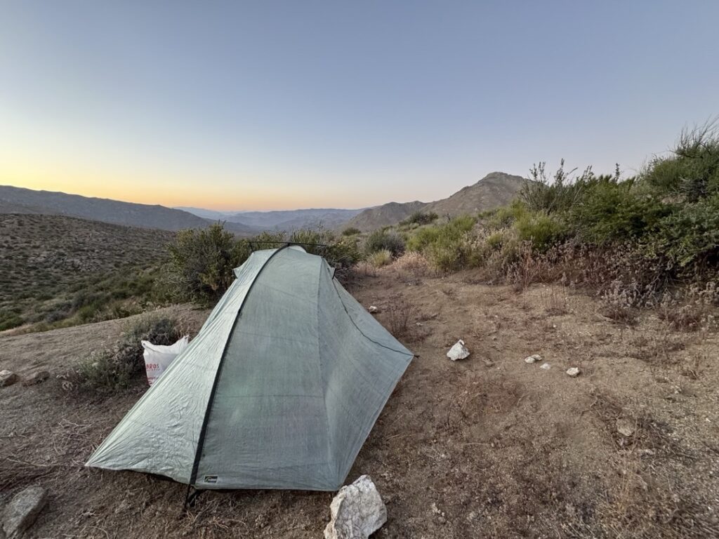 Nach 800 m habe ich dann leicht erhöht einen guten Standort gefunden. Ich war ziemlich happy, da es heute ein recht langer Tag war. So konnte ich noch mit dem letzten Tageslicht mein Zelt aufstellen, mich etwas frisch machen und zu Abendessen.