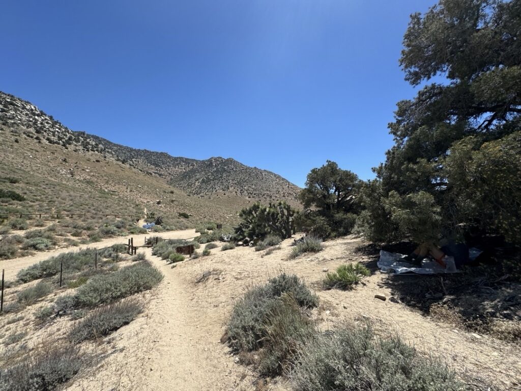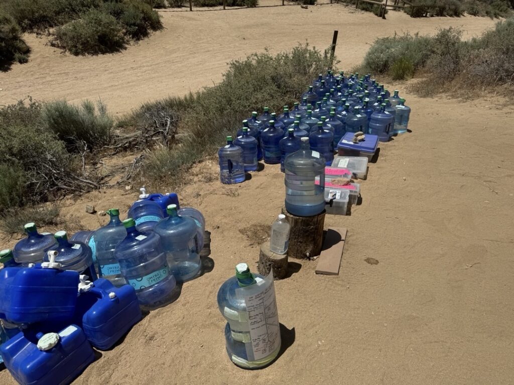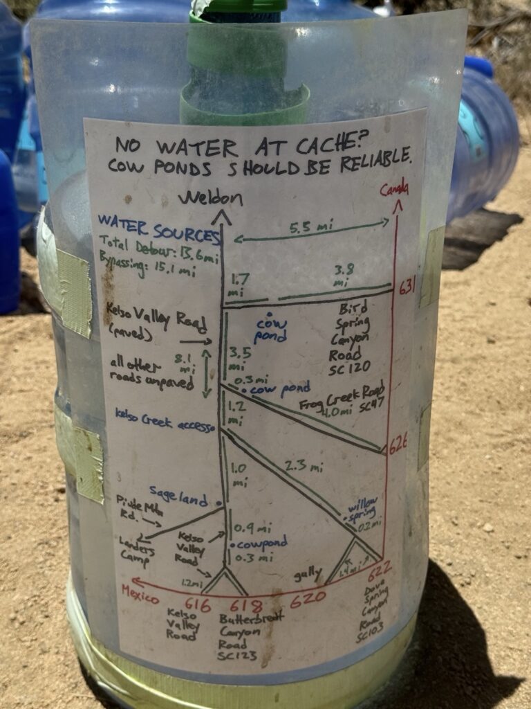 Der Water Cache, Bird Spring Pass, ist ein grosser. Als ich angekommen bin habe ich keine Menschenseele gesehen. Erst als ich nah genug war, habe ich gesehen, dass sämtliche Wanderer sich im Schatten der Bäume aufhalten. Ich habe mir dann einen Schattenplatz direkt neben dem Water Cache genommen.