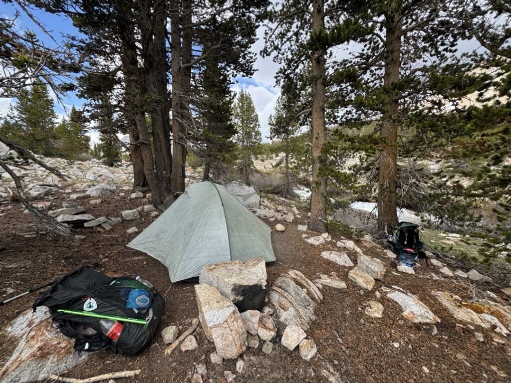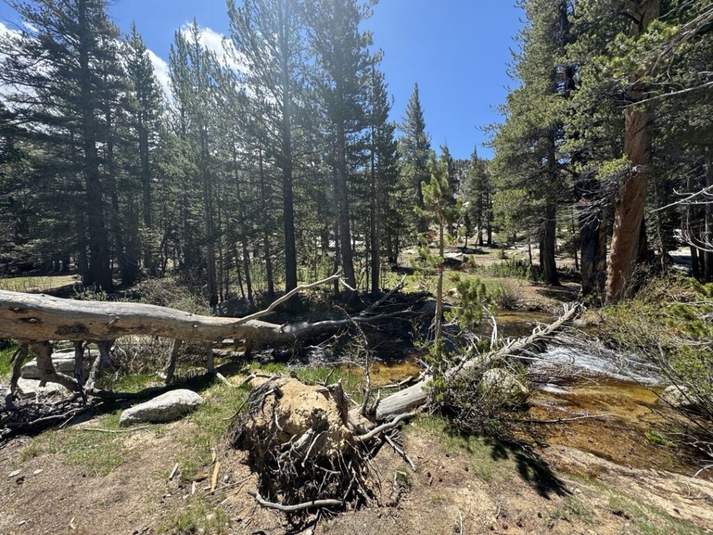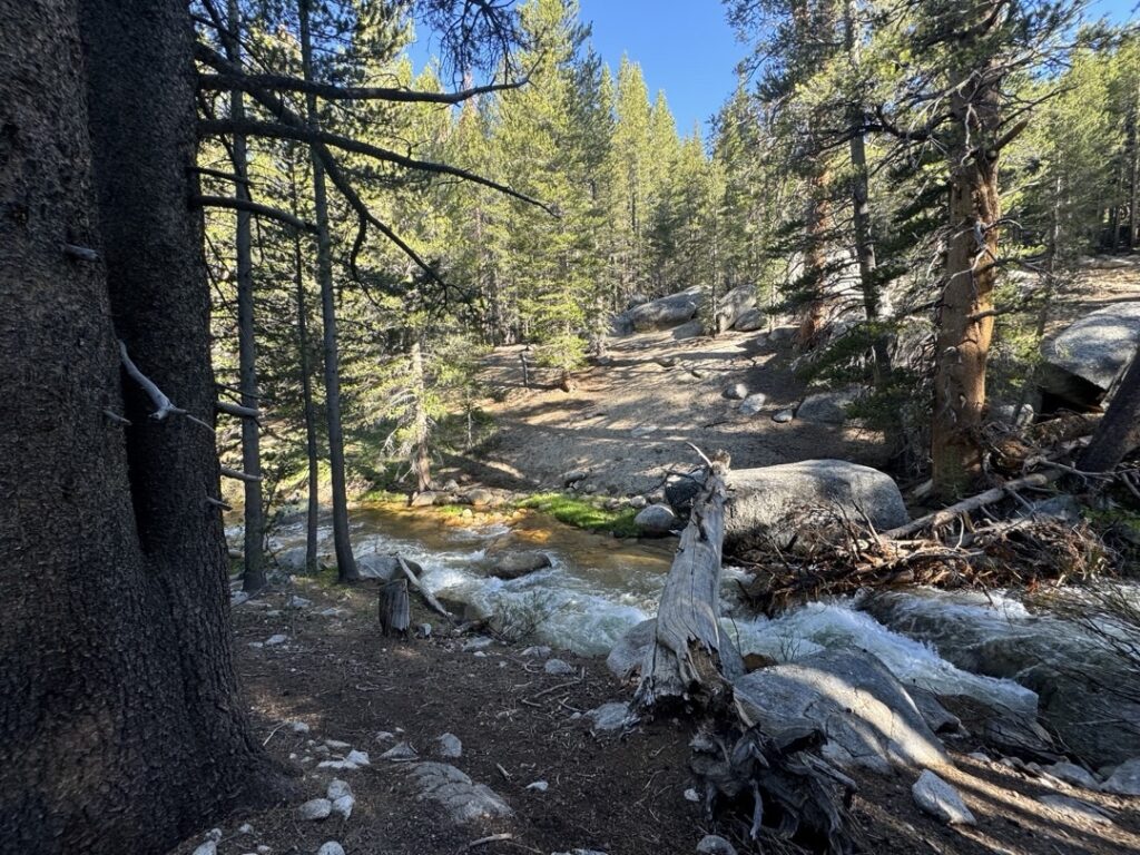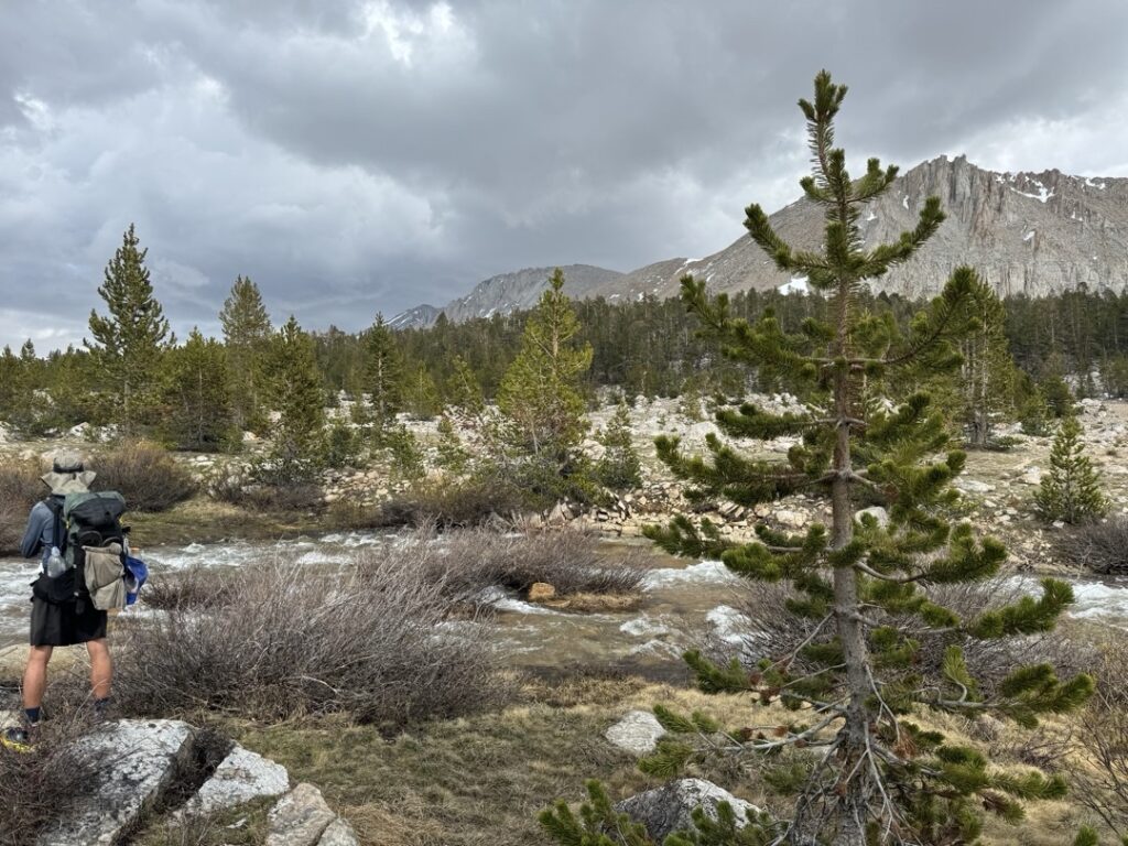 Bei drei Überquerungen innerhalb von ein paar Kilometern, ist dieser Aufwand aber einfach zu gross. So haben wir die ersten zwei Überquerung gut gemeistert. Dann stand die Überquerung des Tyndall Creeks an. Gemäss einem Kommentar auf der FarOut App wurde empfohlen die Überquerung 200 m weiter oben zu versuchen. Mike und ich haben dann geschaut wo es am sichersten rüber geht. Schlussendlich haben wir uns für die breiteste Stelle entschieden, bei welcher die Fliessgeschwindigkeit beziehungsweise die Wasserhöhe am geringsten erschien. Ich habe mich dann mal mutig in die Fluten gestürzt und schnell festgestellt, dass es gut kommt. Das Wasser ist mir zwar bis zu den Knien gekommen aber mithilfe der Trekking Stöcke konnte ich mich sicher auf den Beinen halten. Der Nachteil dieser Fluss überqueren sind unsere nassen Schuhe. Da es kurz vor unserer letzten Flussüberquerung noch leicht zu regnen begonnen hat, werden wir unsere Schuhe bis morgen nicht trocken bringen. Im Moment scheint zwar noch die Abendsonne, diese hat aber nicht sehr viel Energie. Ist nicht optimal, da wir morgen den Forester Pass überqueren werden.